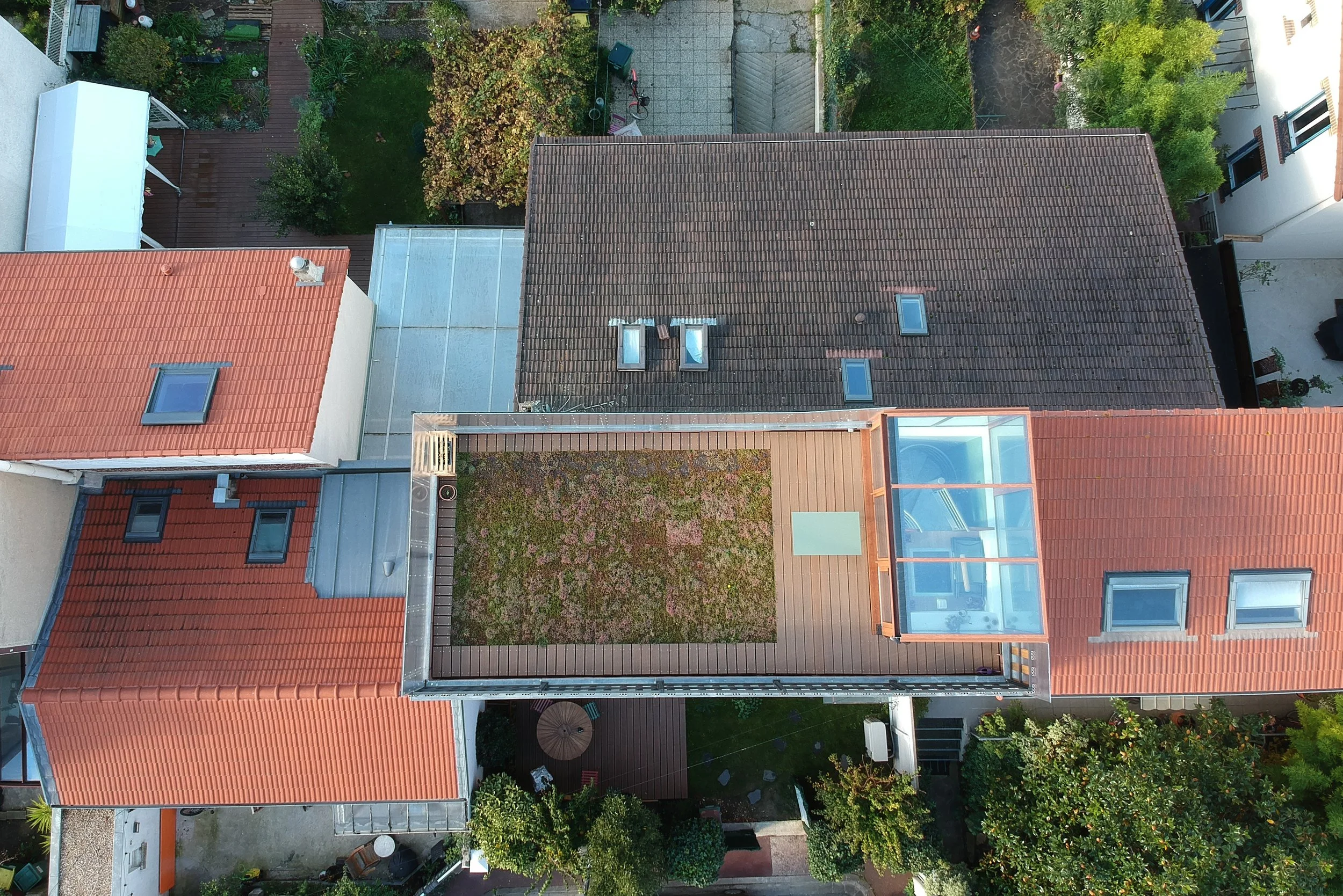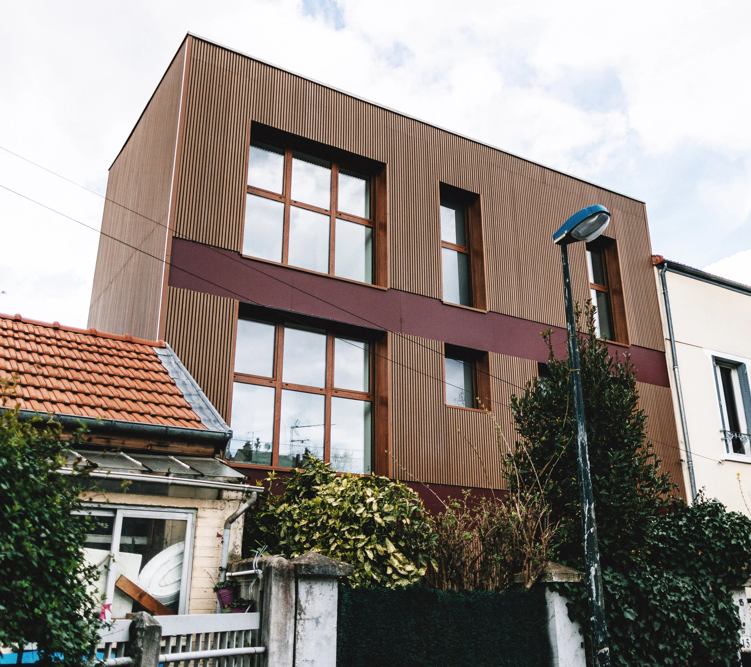 “Pour ce projet, nous avons imaginé une maison en bois, fine et élégante, maximisant l’espace vertical tout en optimisant la surface au sol restreinte. Avec un rez-de-chaussée et deux étages, cette maison dispose d’un toit terrasse accessible, parfait pour profiter des beaux jours.